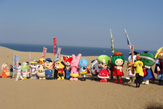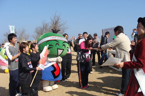 また、この日「ゆるキャラカップin鳥取砂丘」出場のため県内外から集まったゆるキャラ16体も加わり、各チームの「0区」と「ゴール手前7区」で鳥取砂丘を全力疾走する姿は、応援にやって来た親子連れから歓声が上がっていました。